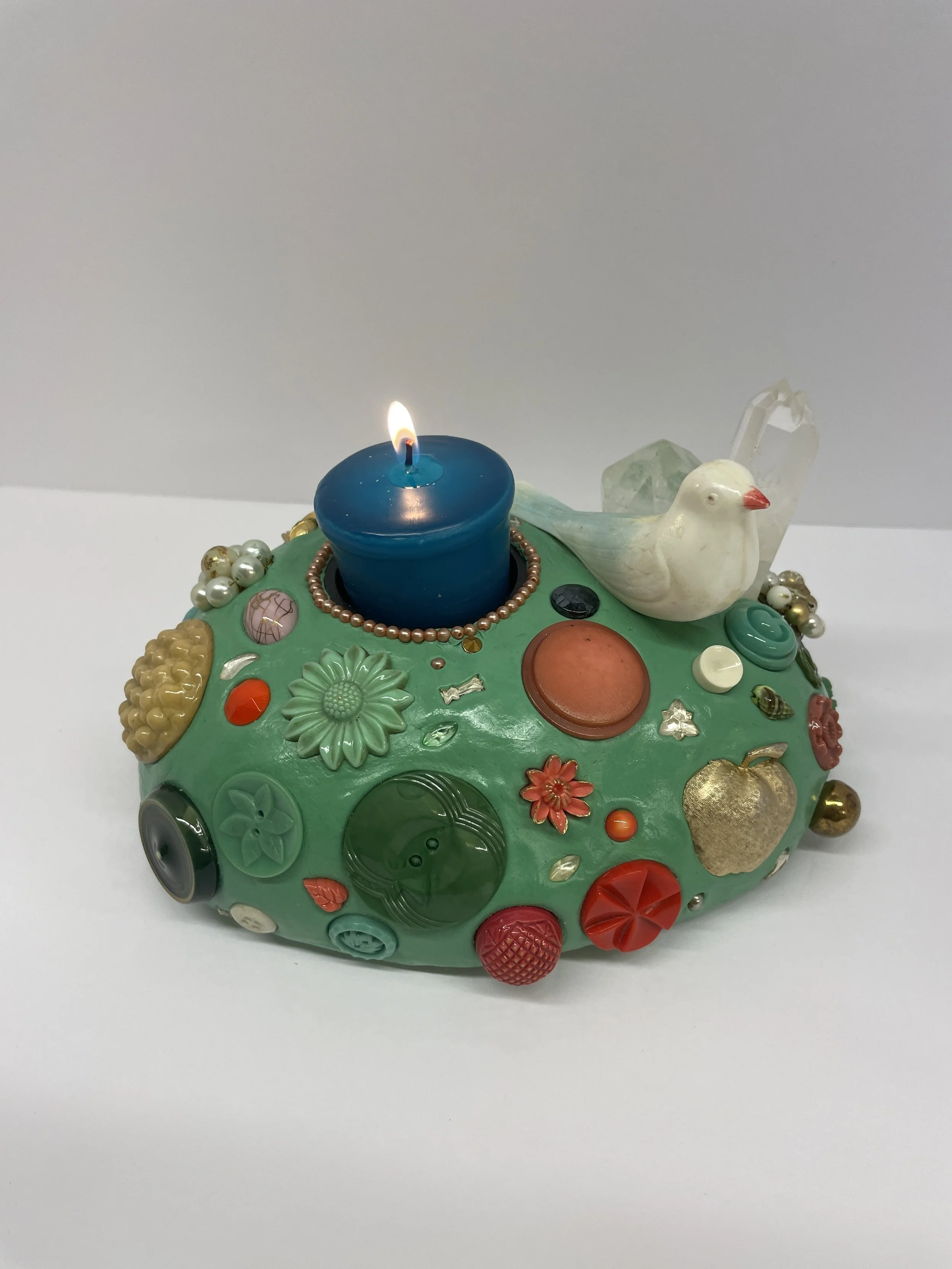 Vintage baubles, beads, buttons and more are embedded in the epoxy-clay. I search high and low for colorful treasures to include in my work.