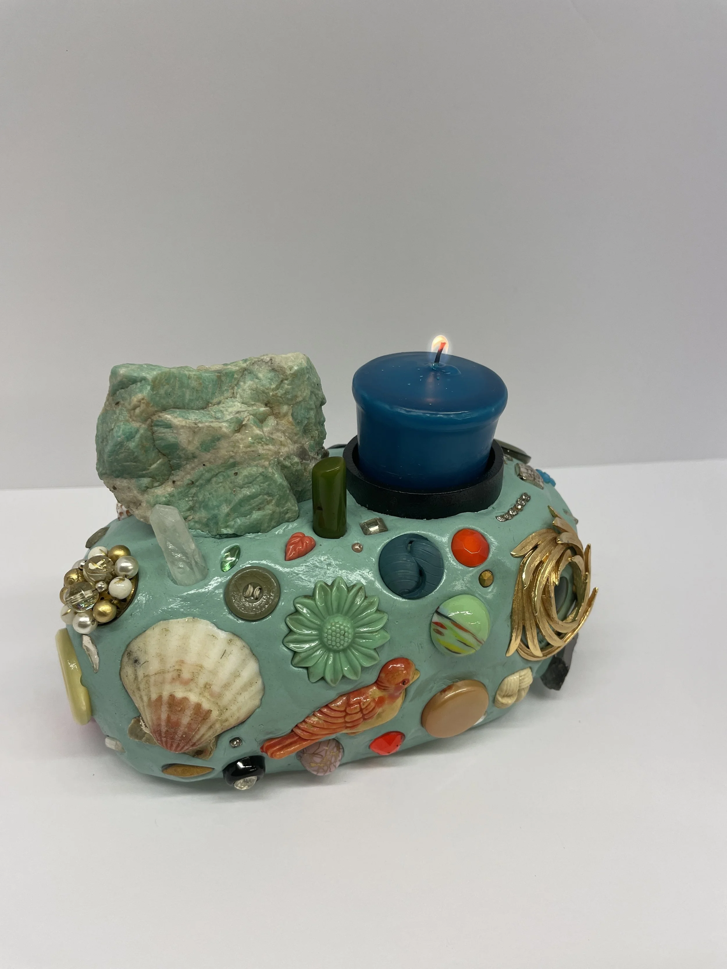 In 2022 I began making Lamps and candle holders from paper mache & Epoxy Clay with embedded found objects. Enjoy!